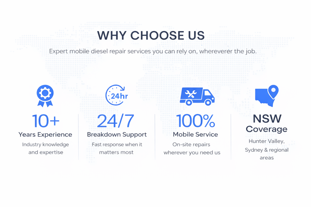 We provide professional mobile diesel repairs and servicing for trucks, mining, agricultural, and heavy equipment, focusing on reducing downtime and keeping machinery operating safely and efficiently.